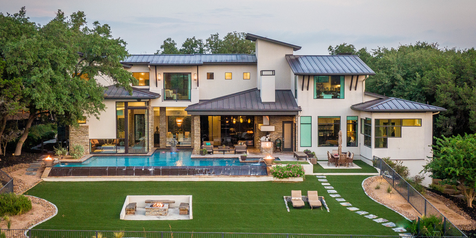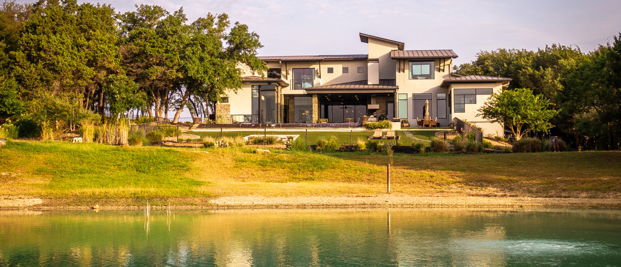 The back of the house is surmounted by a well-manicured lawn.